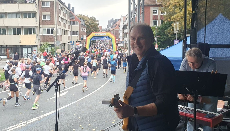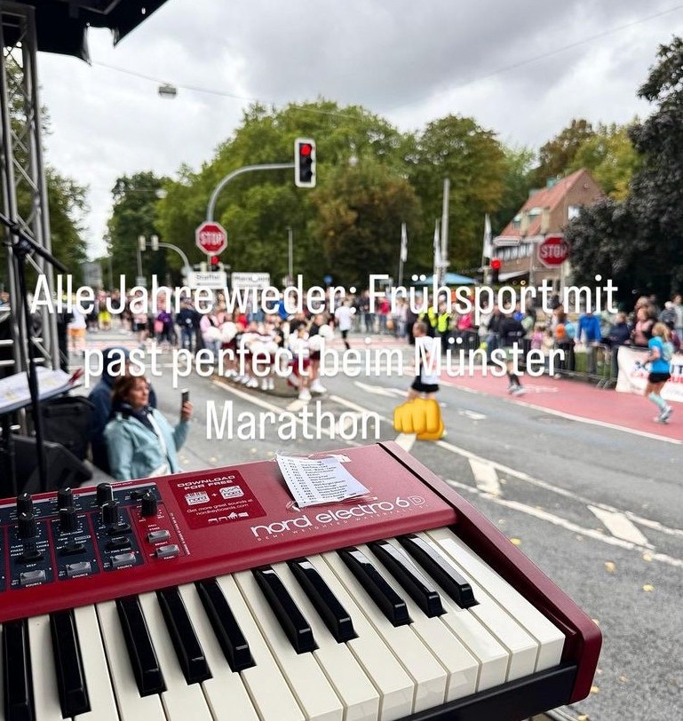 Der VOLKSBANK-MÜNSTER-MARATHON am 08.09.2024 war nicht nur für die über 11.000 Läufer und Läuferinnen eine ziemlich lange Strecke, auch für past perfect war es ein kleiner Marathon, denn mehr als fünf Stunden heizte die Band den Vorbeirennenden und dem Publikum am PowerPoint AEGIDIITOR immer wieder ordentlich ein. Der Auftritt hat den Musikern aber dennoch sehr viel Spaß gemacht und da darf dann am Ende auch mal ein Shirt etwas zu hoch rutschen ...