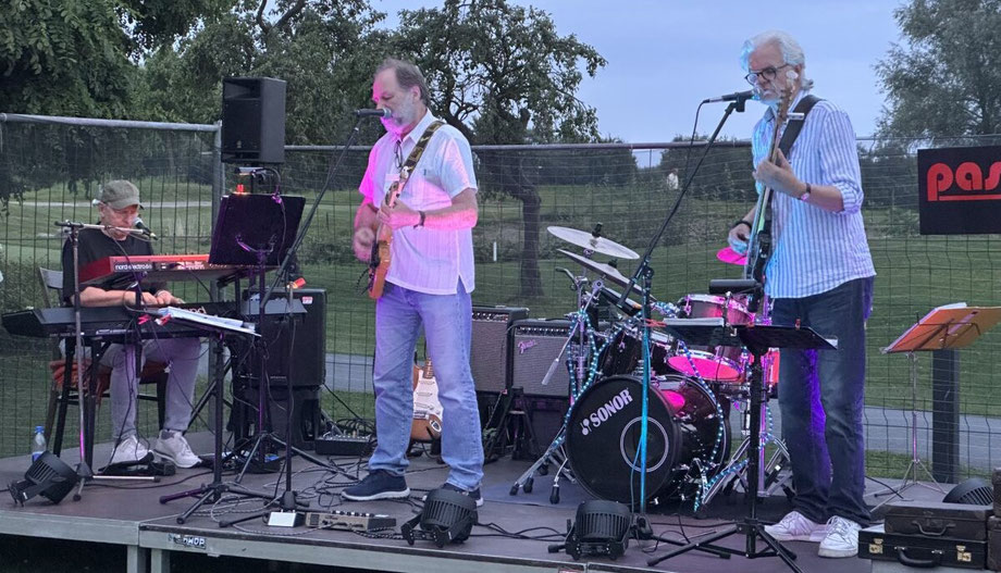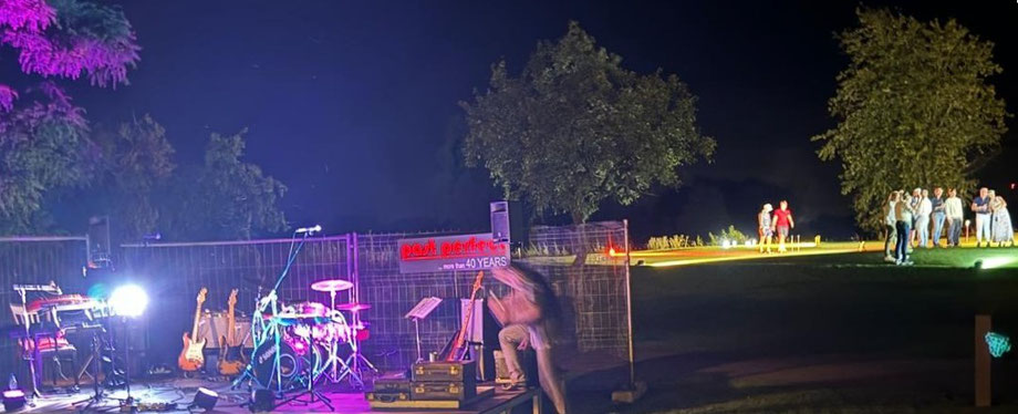 SOMMERFEST beim GOLFCLUB MÜNSTER TINNEN am 10.08.2024: Zunächst der Soundcheck, noch ohne den Drummer. Und nach den letzten Schlägen beim spätabendlichen Turnier ging es dann hinein in eine exotische Musik-Nacht mit besonderer Note für die Lightshow: Tanzende Mücken - und mindestens eine davon hat der Bassist beim Singen verschluckt ...